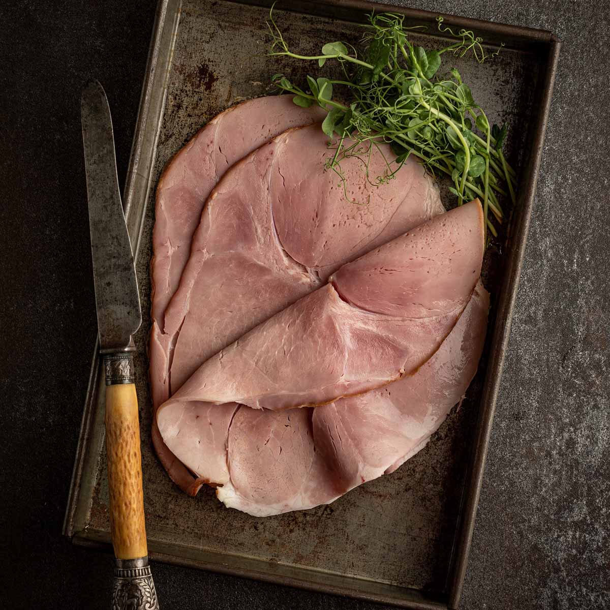 Elegant, thick-cut Bangalow ham slices showcasing the rich flavour and impeccable texture of high-welfare pasture-raised pork.