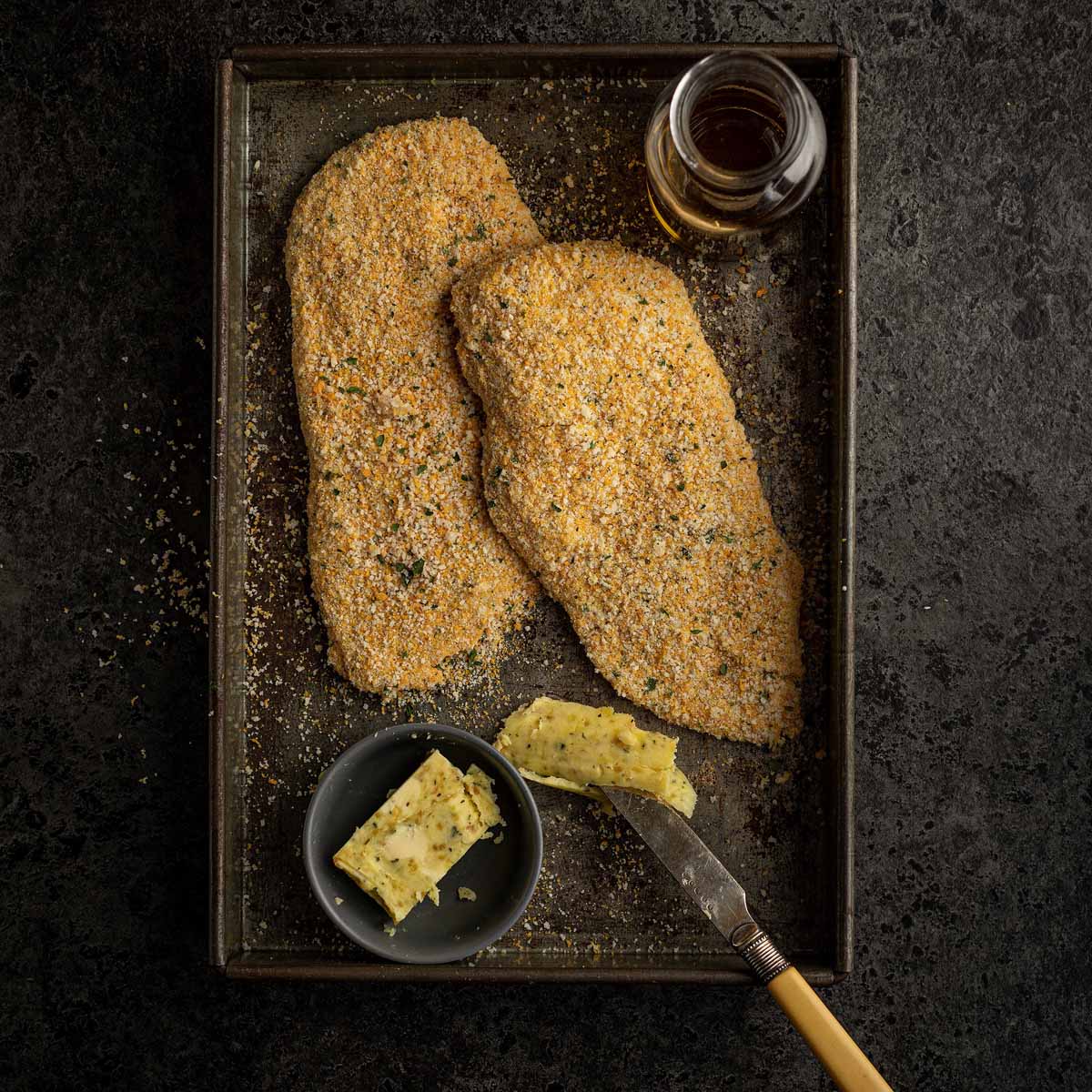 Tender, boneless chicken breast schnitzels, hand-crumbed with gluten-free crumbs, offering crisp, golden texture with tender, flavour-rich meat from pasture-raised chickens.
