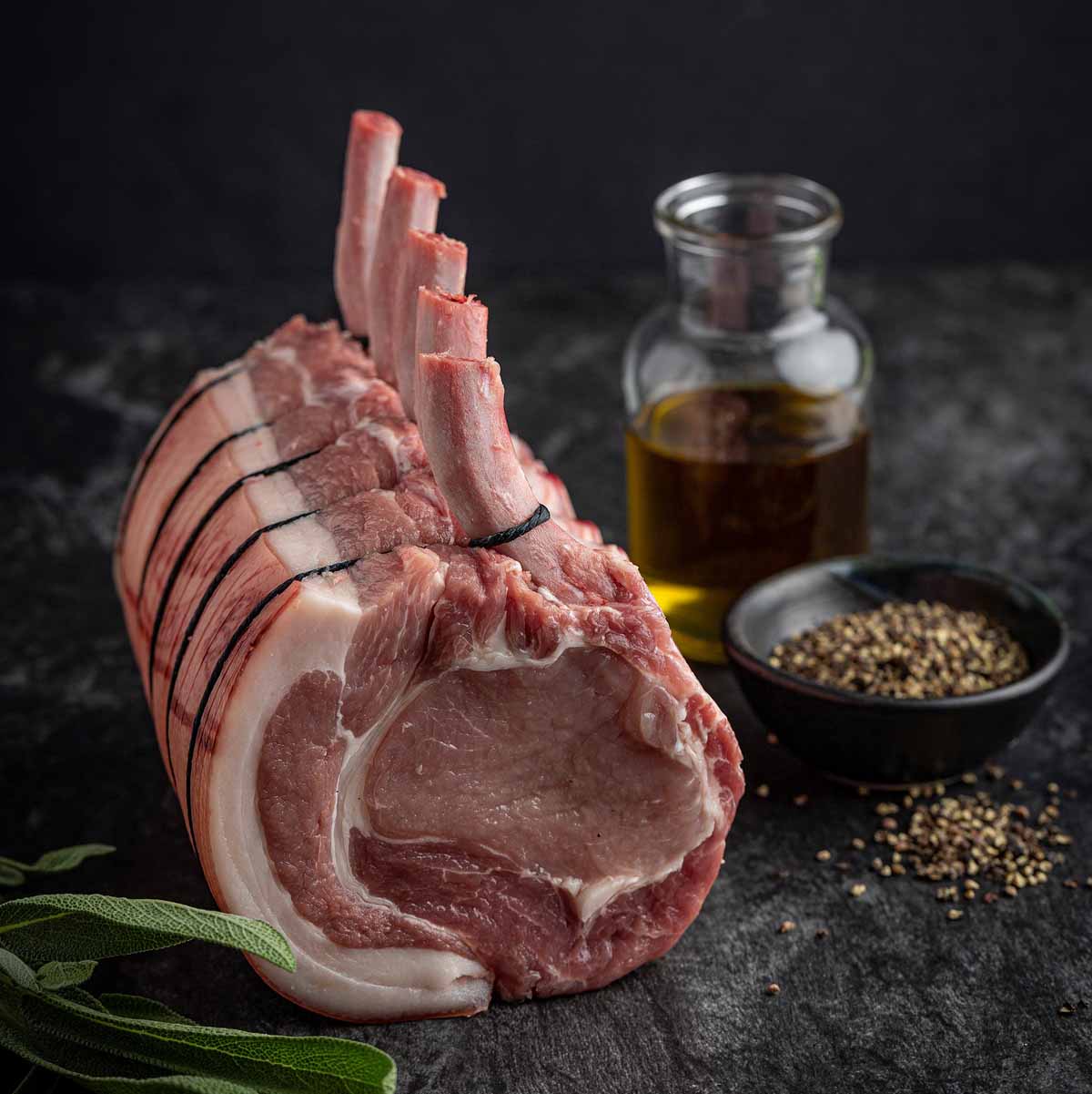 A beautifully trimmed rack of pork ribs, frenched and visually stunning—excellent for elegant roasting or dramatic plating.